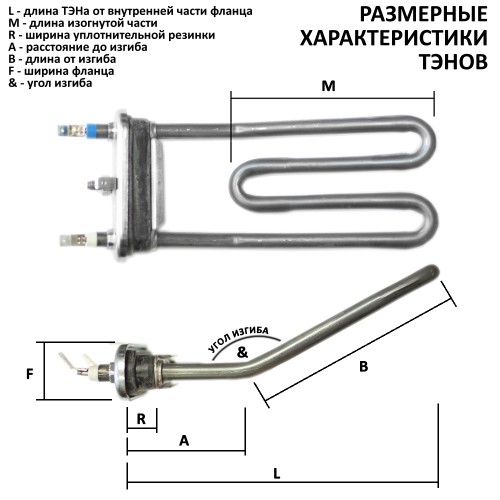 1. Длину ТЭНа. Она замеряется от фланца (основание резинки) до конца греющей трубки. Допускается устанавливать ТЭН короче на 1-2 см.